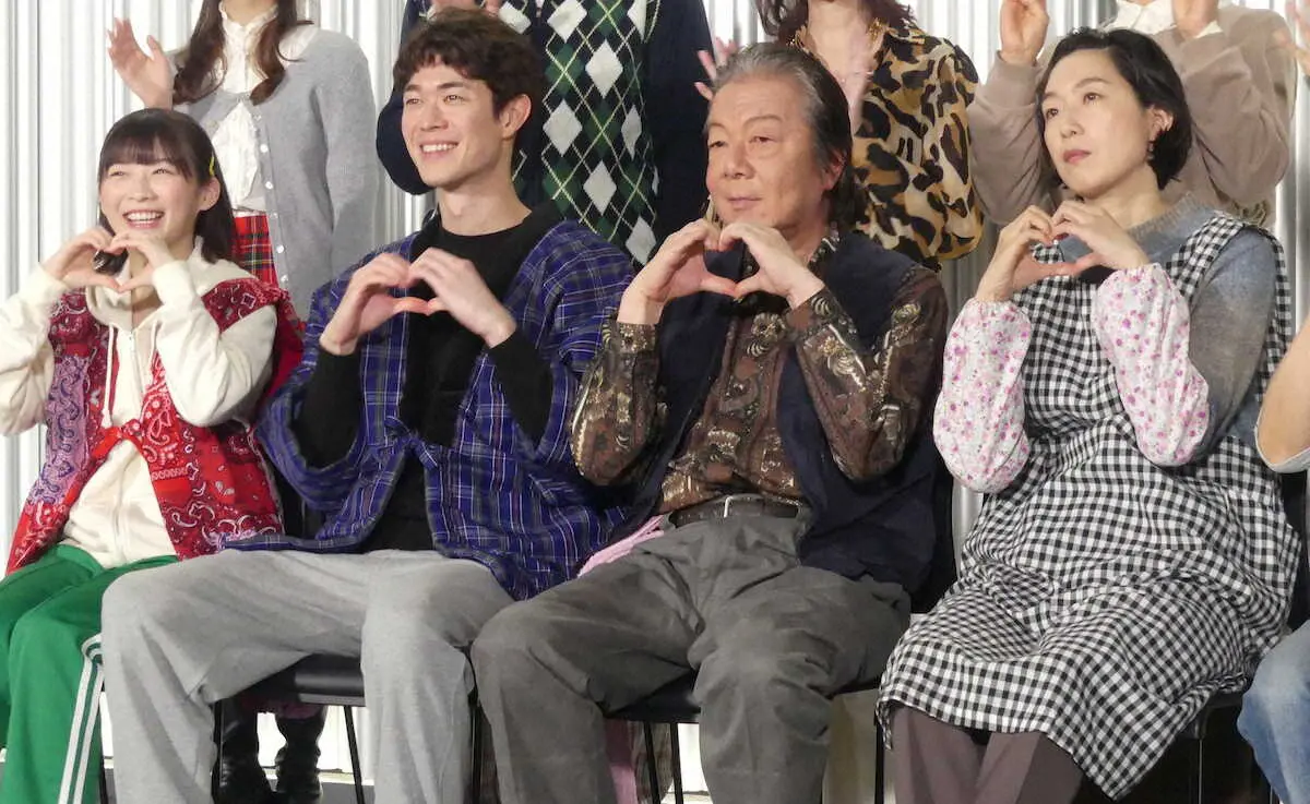 ハートマークでフォトセッションに応じた(左から)伊藤沙莉、宮沢氷魚、古田新太、江口のりこ