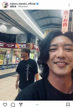 また、自身と黒のTシャツ姿の「純烈」酒井一圭が商店街を歩く2ショットも投稿した。昇と酒井はテレビ朝日系「百獣戦隊ガオレンジャー」(01年)で共演していた。