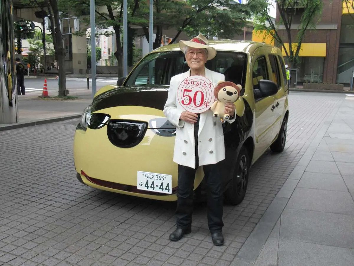 MBSテレビのキャラクターをかたどった「らいよん号」で大阪市内を巡った浜村淳