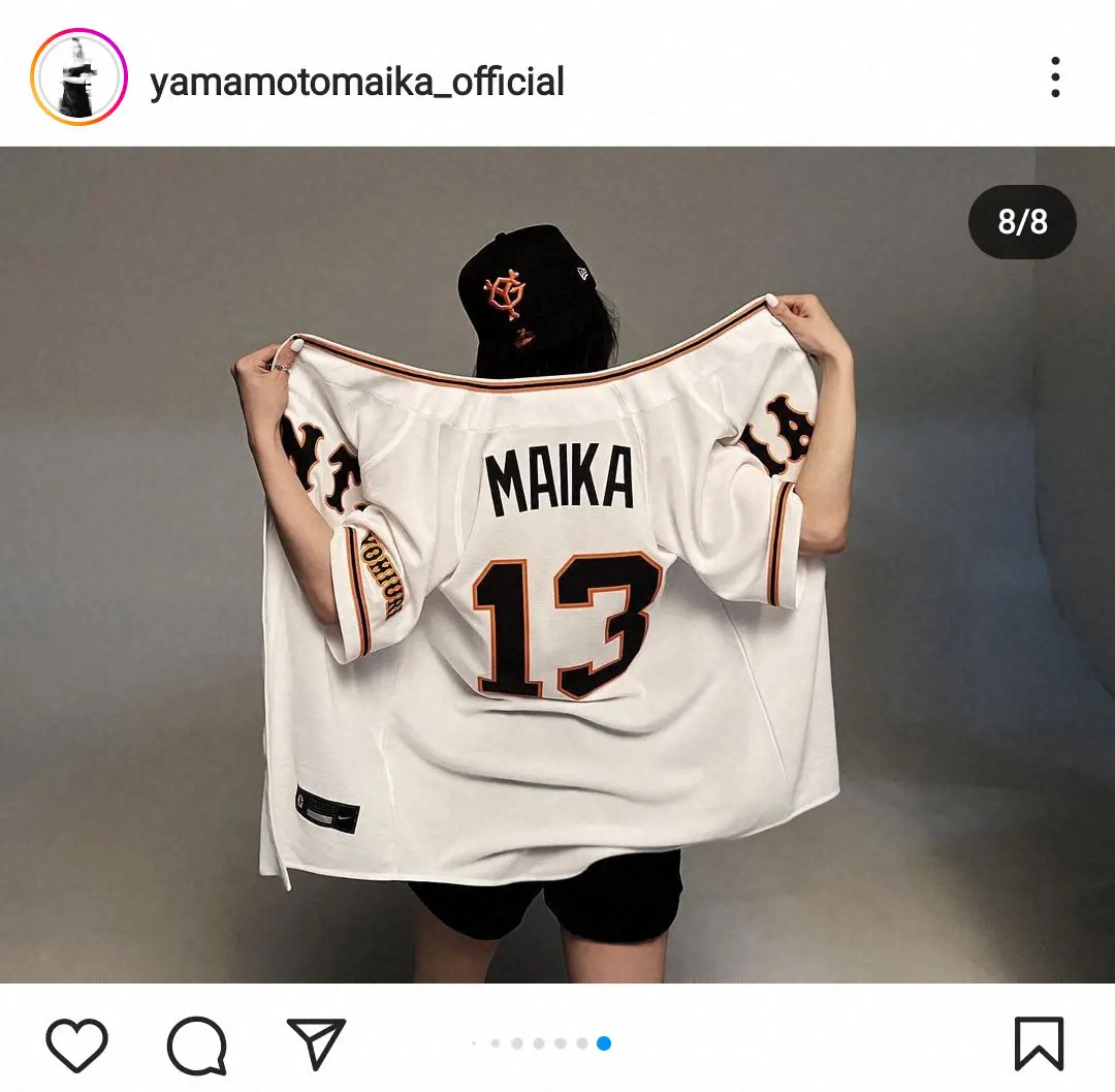 ユニホームとキャップを着用したコラボビジュアルはこの日、巨人の公式インスタグラムで公開されたが、山本はそのオフショットを投稿。ユニホームを羽織って肩やおなかをチラリと見せたショットやショートパンツで美脚を披露した姿など、おしゃれにユニホームを着こなした画像8枚を一気に公開した。