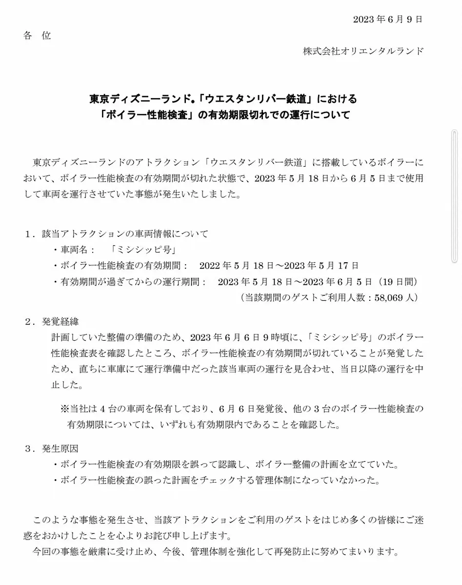 該当アトラクションの車両は、ボイラー性能検査の有効期間が2022年5月18日~2023年5月17日までだったにもかかわらず、有効期間が過ぎた2023年5月18日~2023年6月5日(19日間)の間、運行を続けたという。当該期間のゲスト利用人数は5万8069人だった。