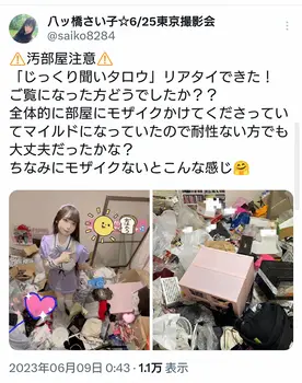 テレビではボカシが入れられていたが、八ッ橋は自身のツイッターで「全体的に部屋にモザイクかけてくださっていてマイルドになっていたので耐性ない方でも大丈夫だったかな?ちなみにモザイクないとこんな感じ」と部屋の様子を投稿。