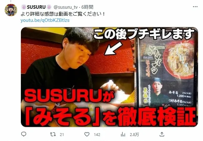 SUSURUは、ユーチューバー・ヒカルがプロデュースしたラーメン「みそる」をレビューするために店舗へ。感想としては「うまかったですよ」と言うも「ヒカルさんが“商品開発に2日”って言ってましたけど、まあ2日の味だよねっていう感じで。1200円と言われたら正直高いかなとは思っちゃいますね」などと評価していた。