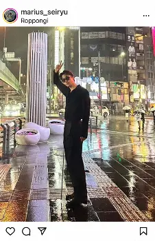 これまでイギリスのロンドン、フランスのパリなど海外に滞在していることを明かしてきたマリウスさん。7日のストーリーズでは飛行機に乗っている様子も公開していたが、この日、「ここ六本木」と日本に帰国し、六本木にいる姿を披露。六本木の交差点で全身黒のスタイルで、サングラスをかけた全身ショットをアップした。