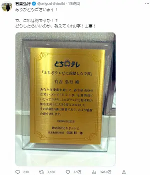 お笑い芸人の有吉弘行(49)が、10日までに自身のツイッターを更新。栃木県のテレビ局から表彰されたことを伝えた。