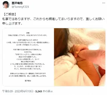 冨沢はツイッターで「【ご報告】私事ではありますが、これからも精進してまいりますので、宜しくお願い申し上げます」として文書の画像を投稿。文書には「私事で恐縮ではございますがこの度、かねてよりお付き合いをしていた一般女性と結婚をしまた第一子が誕生いたしました」と報告した。