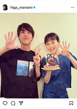 「happy birthday my brother&me」とつづり、俳優の中川大志とのツーショットをアップ。比嘉はケーキを手にしており、「6月14日産まれの私たちで少し早めのお祝いを」とつづった。