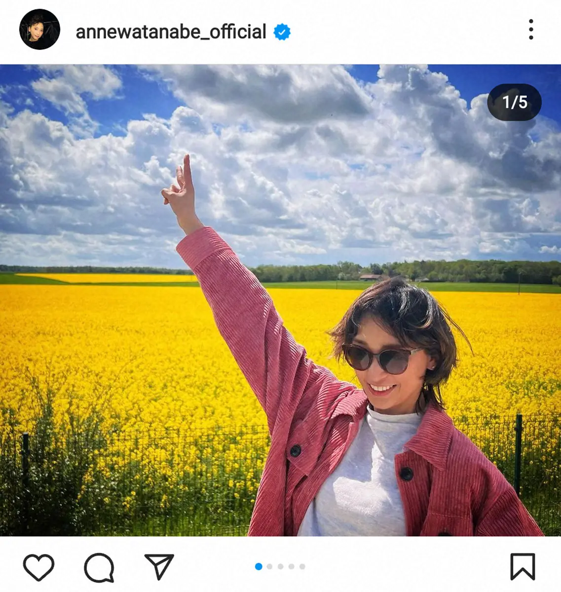 杏は「5月はバカンスだらけで、楽しいことをたくさんしました」とつづり、一面の黄色い花畑をバックに撮った写真を投稿。