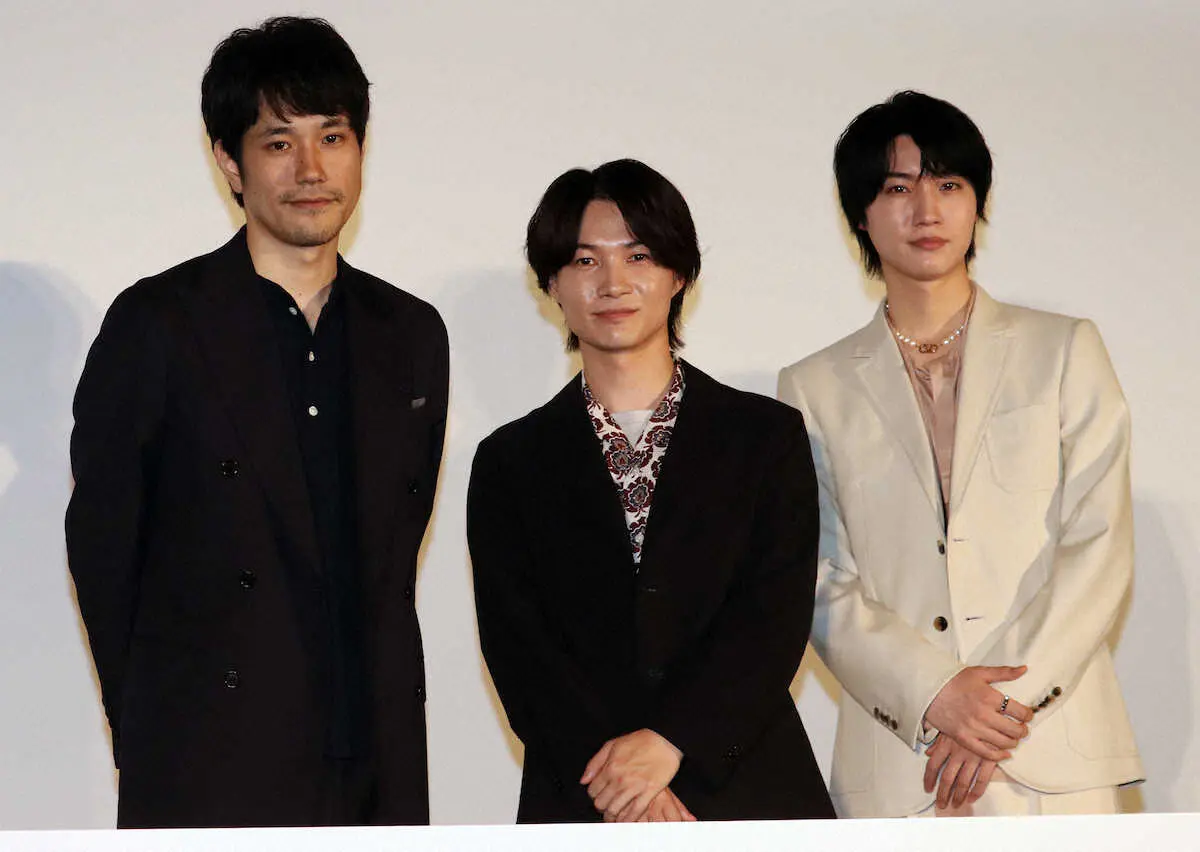 映画「大名倒産」の公開直前イベントに出席した(左から)松山ケンイチ、神木隆之介、桜田通
