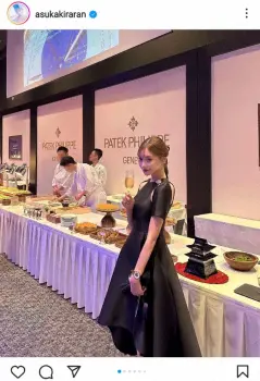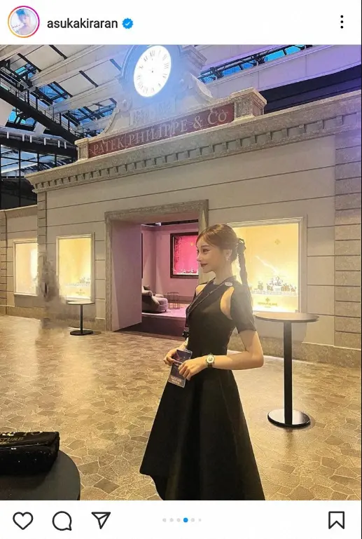 「パテック」とつづり、黒いドレスで、世界的な時計ブランド「パテック・フィリップ」の腕時計を着けている写真をアップした。