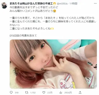 手術の1時間前に撮影された動画で、まあたそは「二重の整形をします」と報告。「一重から二重に化粧でなって、全然顔が違うようになりますよ、どうですかって言って、それをみんなが見てくれてウチを知ってくれた人が多いと思う」「見てくれとる人も一重に悩んどる人が多いのはめちゃめちゃ分かっとって」としつつも「アイプチで二重にするとき、だんだん二重にならんくなってきて」と目に涙を浮かべて語った。