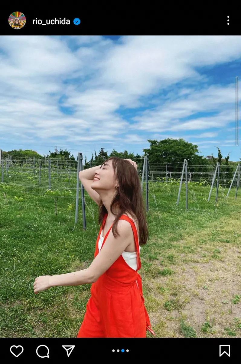 内田は「夏が来る前に梅雨がきちゃった。なんかいつも梅雨を忘れてる。どんよりした天気の月曜日だけど1週間がんばろうね!」と投稿。青空の下、鮮やかなオレンジ色のサロペット姿で雑誌の撮影に臨む写真をアップした。