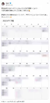 スケジュールはびっしりと埋まっており、モザイクがかかっていないのは27日と31日の2日だけとなっているが、フォロワーからのコメントの返信で「空いてるとこは休みじゃなくて写真集の撮影を入れる予定だから走り切るわよ」としており、実質無休の1カ月となっていることを明かした。