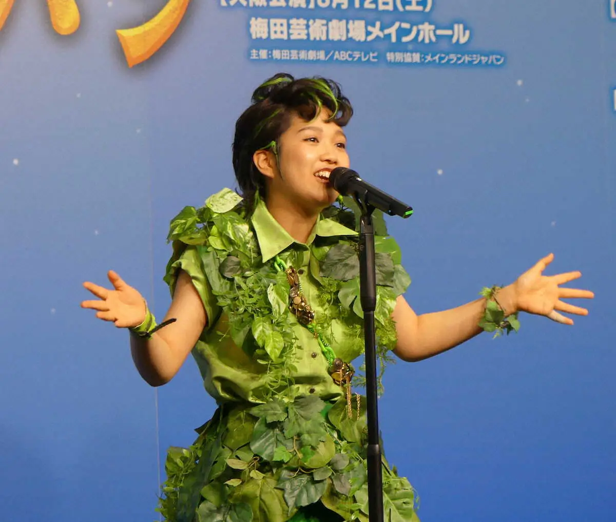 伸びやかな歌声で劇中歌「アイム・フライング」を披露。今回のピーター・パンのイメージは「ヤンチャ」。衣装は葉っぱ風で、タイツは穴だらけだ。