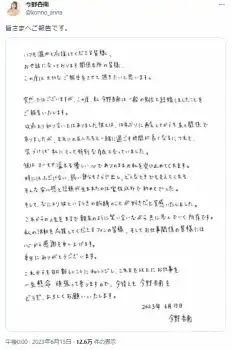「私の活動を応援してくださるファンの皆様、そしてお仕事関係の皆様には心から感謝を申し上げます。本当にありがとうございます。これからも日々新しいことにチャレンジし、これまで以上にお仕事を一生懸命頑張って参りますので、今後とも今野杏南をどうぞ、よろしくお願いいたします。2023年6月15日 今野杏南」と結んだ。