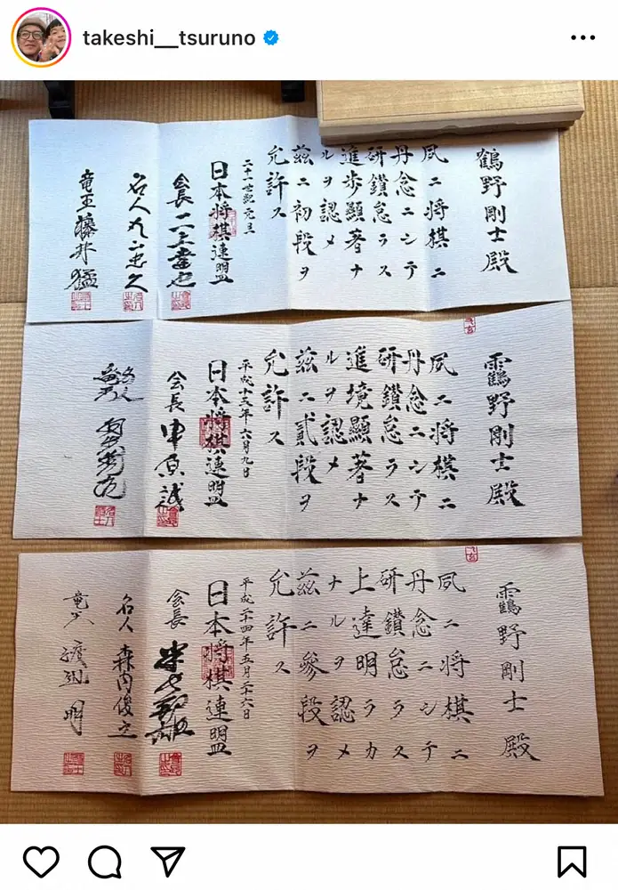 俳優・つるの剛士(48)が15日、自身のインスタグラムを更新。将棋の“免状”の写真で本名を公開し、反響を呼んでいる。
