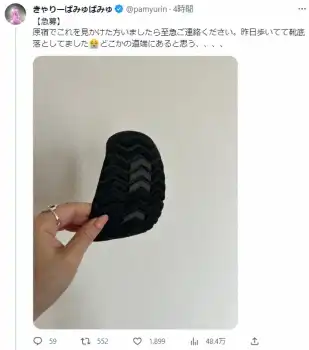この日のお昼ごろ、「【急募】原宿でこれを見かけた方いましたら至急ご連絡ください。昨日歩いてて靴底落としてました どこかの道端にあると思う この靴の裏ぞこなの」と、写真を添えて投稿。靴底が外れてしまい、原宿のどこかに失くしてしまったという。