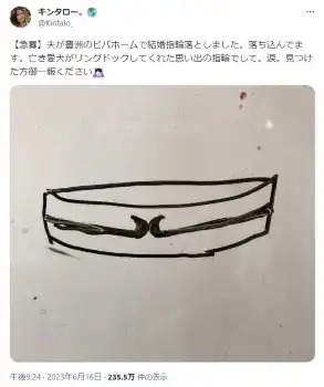 キンタロー。は「【急募】夫が豊洲のビバホームで結婚指輪落としました。落ち込んでます。亡き愛犬がリングドックしてくれた思い出の指輪でして。涙。見つけた方御一報ください」と指輪のイラストとともに呼びかけ。「場所なんですが、汐留の日テレの方で落とした可能性もあるみたいです よろしくお願いします」と呼びかけた。