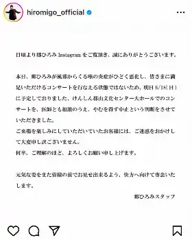 郷ひろみのインスタグラムで「スタッフよりお知らせです」として更新され、文書の画像を投稿。文書には「本日、郷ひろみが風邪からくる喉の炎症がひどく悪化し、皆さまに満足いただけるコンサートを行える状態ではないため、明日6/18(日)に予定しておりました、けんしん郡山文化センター大ホールでのコンサートを、医師とも相談のうえ、やむを得ず中止という判断をさせていただきました」と報告した。