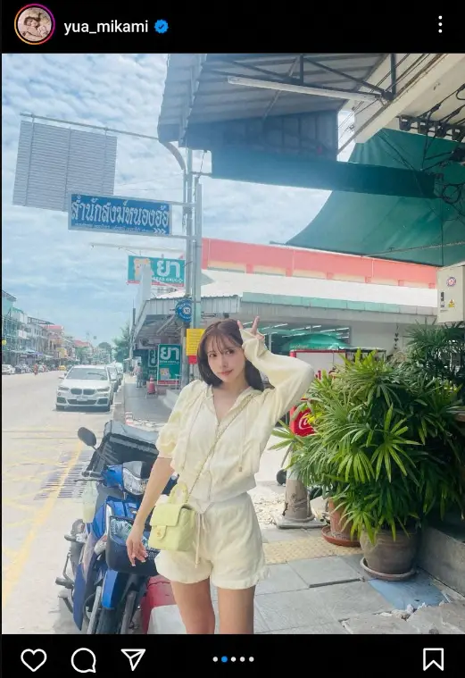 「楽しい TH」とつづり、訪問先のタイの街中での黄色のショートパンツのセットアップ姿の写真をアップした。