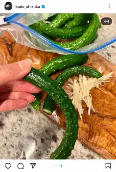 また「お酢で漬けた玉ねぎに、きゅうり、タコ お庭の柑橘に、塩、オリーブオイル」も紹介。「このキュウリが売っていると、冷蔵庫にキュウリがあっても買って漬けてしまいます」とお気に入りのキュウリも披露した。