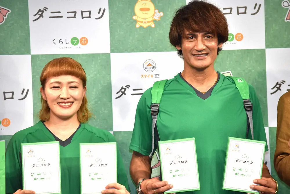 「ダニ防衛隊日本代表結成記者会見」に出席した丸山桂里奈(左)と本並健治氏