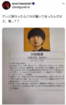 川谷は「テレビ局行ったらこれが置いてあったんだけど、俺…??」と自身の顔写真、「川谷絵音(かわたにえのん) アーティスト」としてプロフィールが書かれた資料らしき紙を画像で投稿した。