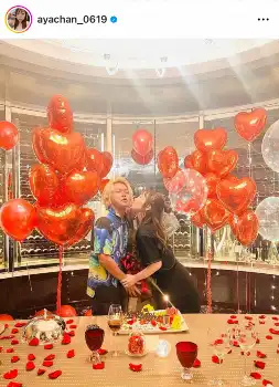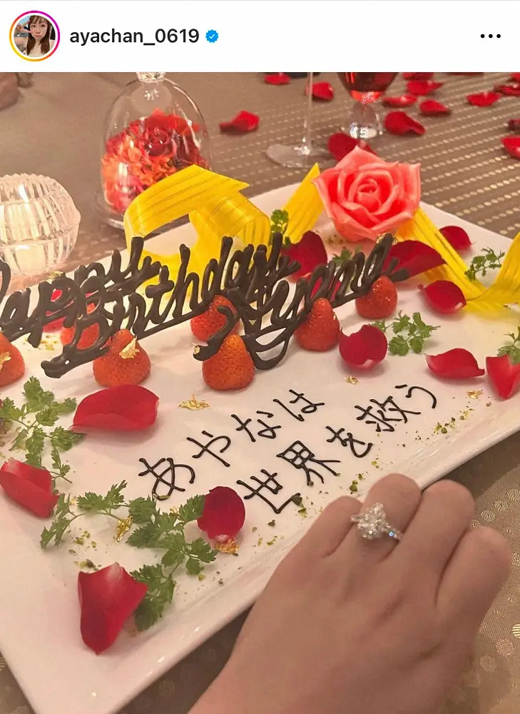 今月19日に30歳の誕生日を迎えたあやなん。「20代最後の日はうーくんと2人きりのディナーでなんと、婚約指輪と100本のバラをもらいました」と、大きな花束と大きなダイヤが輝く婚約指輪の写真を公開した。