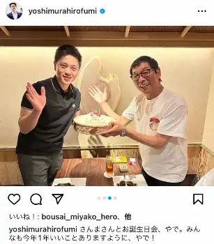 吉村氏は「さんまさんとお誕生日会、やで。みんなも今年1年いいことありますように、やで!」とつづり、さんまとプレゼントを渡し合う写真などをアップした。