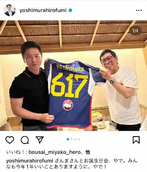吉村氏は6月17日、さんまは7月1日と誕生日が近く、まとめて誕生日会を開いたようだ。写真では、「YOSHIMURA」の名前と誕生日「617」の背番号、さんまを象徴する出っ歯のキャラクターが入ったオリジナルのサッカーユニホームをプレゼントされ、笑顔の吉村氏。また、吉村氏からは、とっくりを持つ信楽のタヌキのようなフォルムで顔はさんまそっくりの置物が。お互いにオリジナリティーの高い凝ったプレゼントを交換する様子が、披露された。