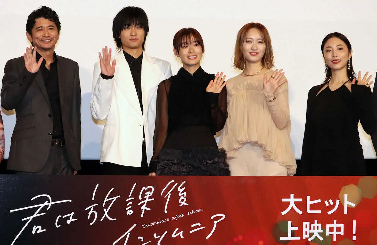 映画「君は放課後インソムニア」の公開記念舞台あいさつを行った(左から)萩原聖人、奥平大兼、森七菜、工藤遥、MEGUMI