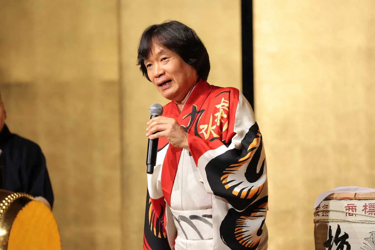 伝統河内音頭継承者の河内家菊水丸(60)が25日、大阪市内で、盆踊りツアーの出陣式に臨んだ。感染拡大した新型コロナウイルスの影響で4年ぶりの出陣式。7月1日、大阪府八尾市から始まるツアーへ向け「たまりたまったパワーを本気でぶつけたい。(2月に還暦を迎え)生まれ変わった河内家菊水丸になりたい」と意欲を示した。