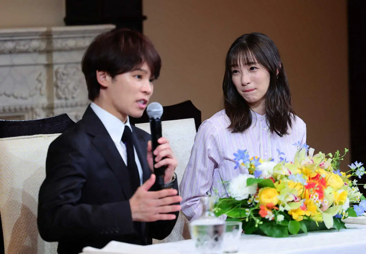 <足立梨花、TATSU結婚会見>会見するTATSU(左)を見つめる足立梨花(撮影・光山 貴大)