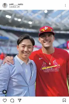 ヌートバーが所属するカージナルスと、鈴木誠也が所属するカブスが“野球不毛の地”ロンドンで公式戦「ロンドン・シリーズ」を行うにあたり、斎藤氏がヌートバーとの再会と、MLBの野球普及活動の取材という2つの目的を果たすために英国入り。試合前にグラウンド内で再会を果たした。