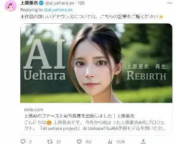 上原亜衣 AIグラビア写真集出版を報告「私のファンの方はもちろん、AIに興味がある方も」