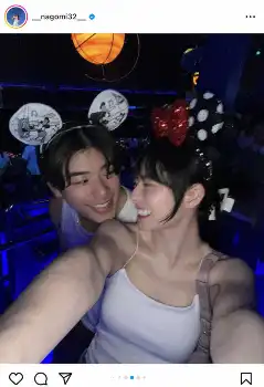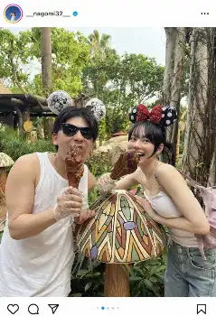 なごみの公式インスタグラムから(@_nagomi32_)。香港ディズニーランドで自撮りするこーくんとなごみ(右)
