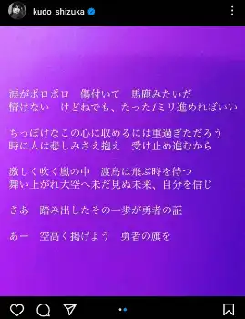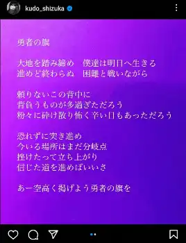 歌手の工藤静香(53)が29日、自身のインスタグラムを更新。新曲「勇者の旗」の歌詞を公開した。