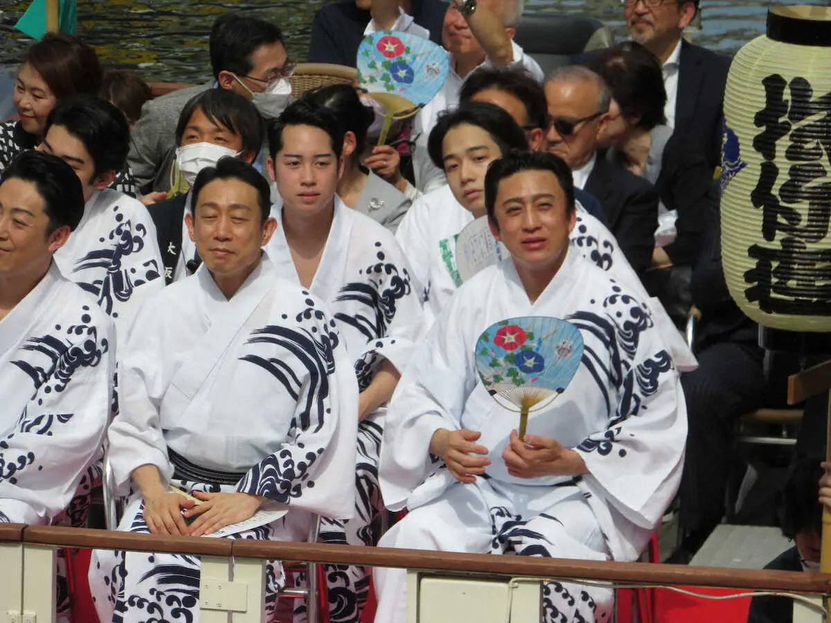 コロナ禍の20、21年は中止となり、昨年は出演者を含む関係者のみで実施されたが、今年はファンも含めた約200人が乗り込む本来の形が4年ぶりに“完全復活”。約1000人の観衆からの「待ってました!」などとというかけ声に、浴衣姿の片岡仁左衛門(79)や中村鴈治郎(64)、若手の中村隼人(29)らが手を振って応えた。
