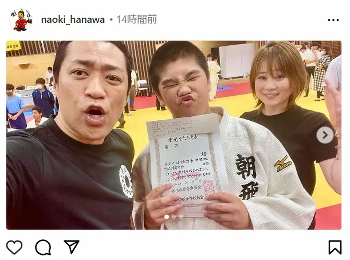 はなわは「三男坊の昇利が、中学生になってはじめての大会『横浜市中学校総合体育大会・男子個人戦』に出場しました。2・3年生も出場するこの大会で、見事に準優勝を飾る事ができました」と投稿。賞状を手にした三男との写真をアップし「よく頑張りました。朝飛道場のみんなも頑張りました!」と健闘を称えた。