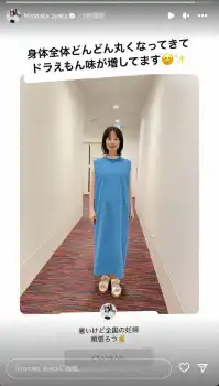 水色のゆったりしたワンピース姿で、お腹もややふっくらしている様子。「身体全体どんどん丸くなってきてドラえもん味が増してます」「熱いけど全国の妊婦頑張ろう」と添えた。