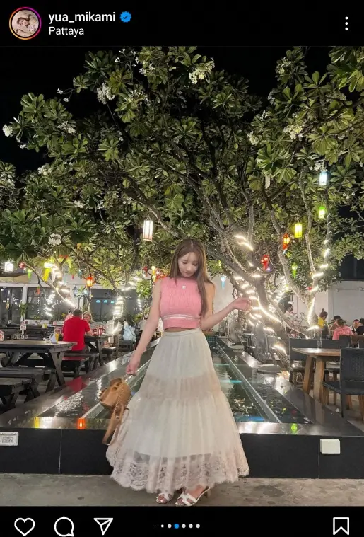 SKE48の元メンバーでタレントの三上悠亜(29)が6日までに自身のインスタグラムを更新。ピンクのノースリーブ&白スカートのパタヤ・ショットを披露した。