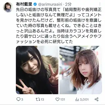 この投稿には「人間できてる。可愛い」「藍里さんの家族はみなさんステキ」「私の場合は姉と一番比べていたのはきっと自分自身でしたが、そんなふうに言える藍里さんはとても素敵」「家族と比べてられて、コンプレックスと思ってる人もいるけど受け止め方は人それぞれ」「整形前の顔も、整形後の顔もどちらもチャーミングでかわいい。大好きです」などと、さまざまなコメントが寄せられた。