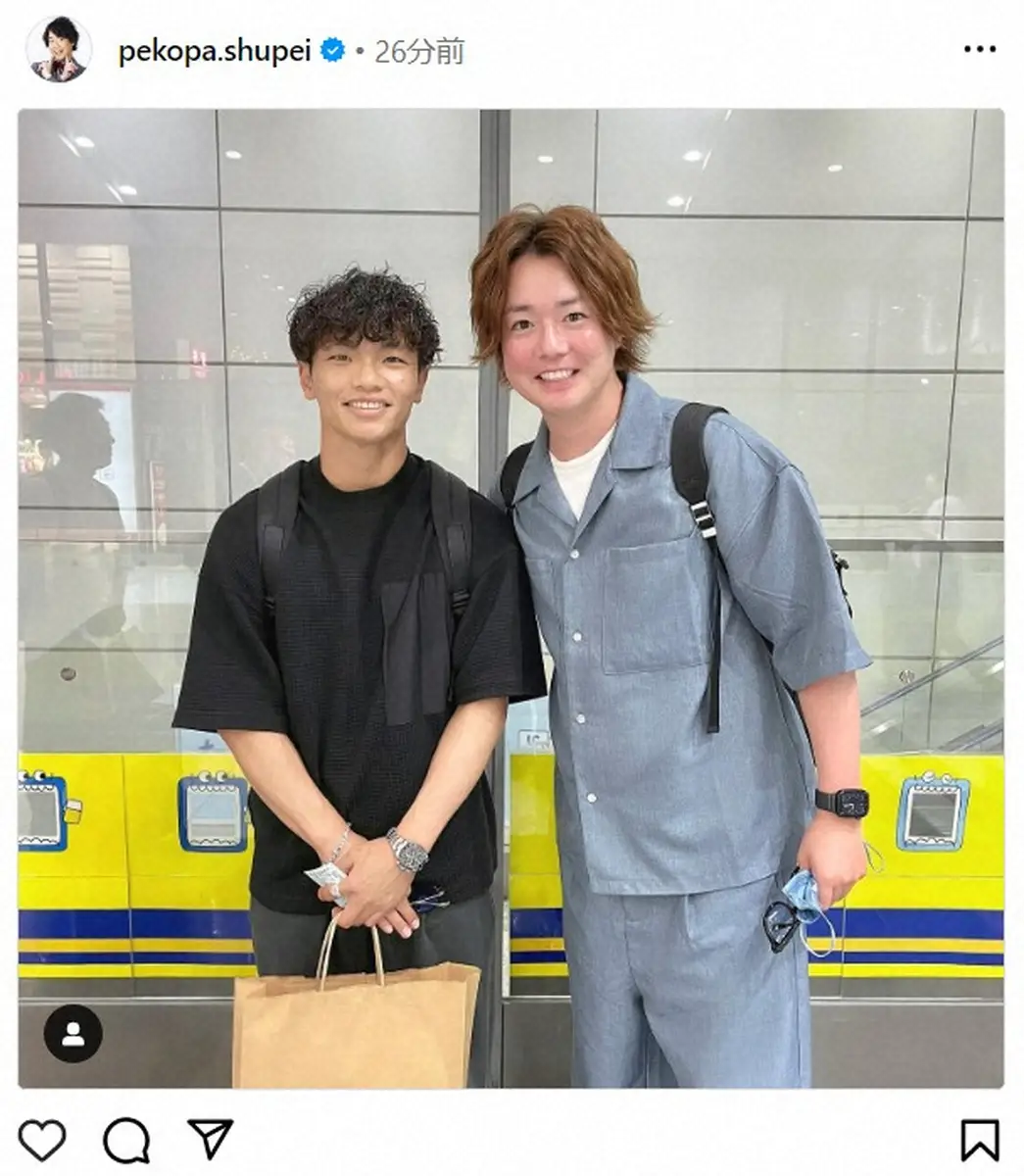 シュウペイは「好きなサッカー選手 旗手怜央選手」とつづり、サッカー日本代表MF旗手怜央(25=セルティック)との2ショットをアップ。「怜央くんが僕に気づいて声かけてくれた」といい「嬉しかった!ありがとう!」と喜んだ。