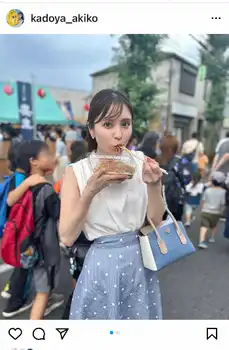 「今年初めての夏祭り」とお祭りに出向いた際のショットを公開。白のノースリーブのトップス、水色に白の水玉が入ったスカート、白と水色のバッグという清楚なスタイルで、焼きそばを豪快に頬張る姿を披露した。
