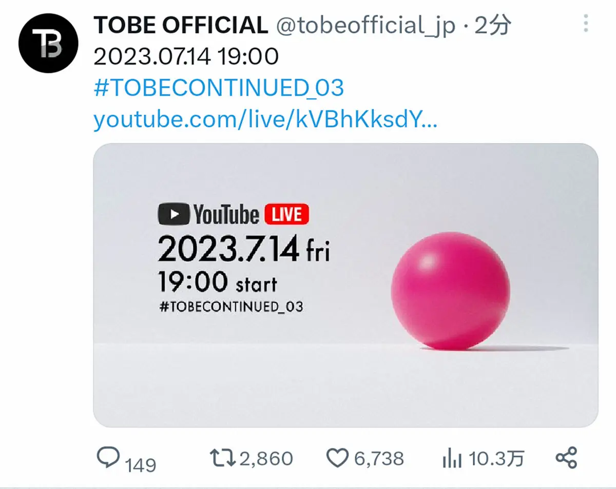 滝沢秀明氏が代表取締役を務める株式会社TOBEの公式ツイッター(@tobeofficial_jp)から 滝沢秀明氏設立「TOBE」第3弾の生配信を告知 ピンクのボールの画像に「来… ギャラリーで見る この記事のフォト 2023年07月11日の画像一覧 もっと見る 2023年07月11日の画像をもっと見る