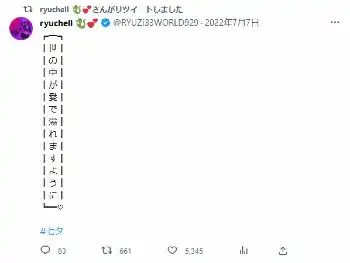 ryuchellさんは1年前の22年7月7日、自身のツイッターに短冊を模した囲いの中に縦書きで記した「世の中が愛で溢れますように」という願いを投稿。今年の七夕には、この投稿をリツイートしていた。死亡のニュースが流れて以降、この投稿にも注目が集まり、ファンの悲しみの書き込みが相次いでいる。