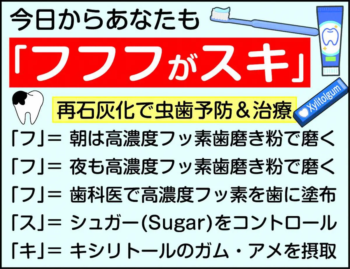 人生100年時代。一生自分の歯で、おいしいものを食べたいじゃないですか。倉治先生も「初期の虫歯なら、フッ素やキシリトールで修復できる」とおっしゃってます。きょうから「フフフがスキ」始めましょうよ。