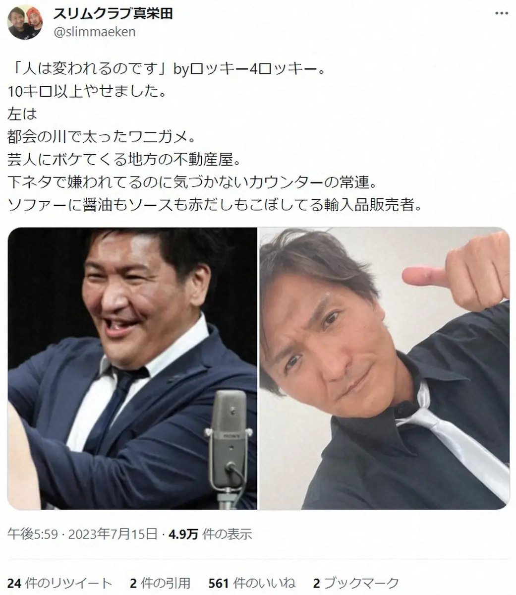 お笑いコンビ「スリムクラブ」の真栄田賢 Photo by スポニチ スリムクラブ・真栄田賢「10キロ以上やせました」 ビフォアフ公開で「カ… ギャラリーで見る この記事のフォト 2023年07月16日の画像一覧 もっと見る 2023年07月16日の画像をもっと見る