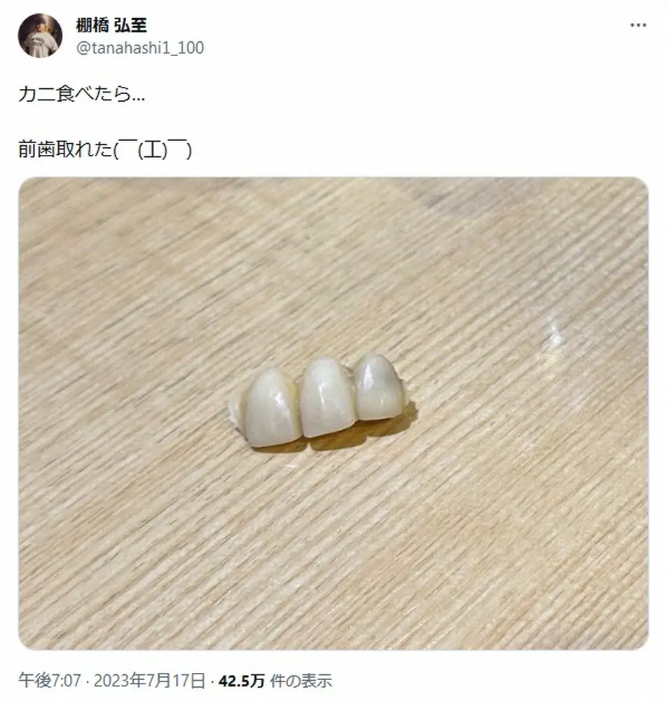 新日本プロレス・棚橋弘至のツイッター(@tanahashi1_100)より 以前、プロテインバーが原因で取れた前歯 新日本プロレス・棚橋弘至 100年に1人の逸材でもかなわない“天敵”再び!… ギャラリーで見る この記事のフォト 2023年07月18日の画像一覧 もっと見る 2023年07月18日の画像をもっと見る