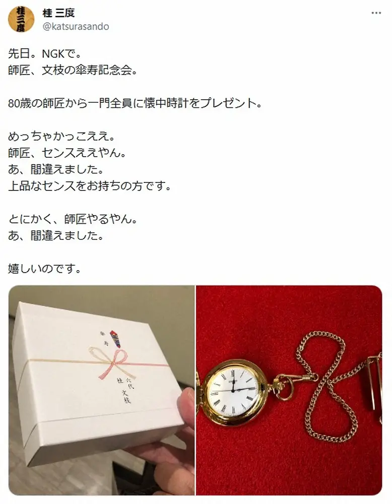 「先日。NGKで。師匠、文枝の傘寿記念会。80歳の師匠から一門全員に懐中時計をプレゼント」と、7月16日に80歳の誕生日を迎えた文枝から、懐中時計をもらったことを報告。